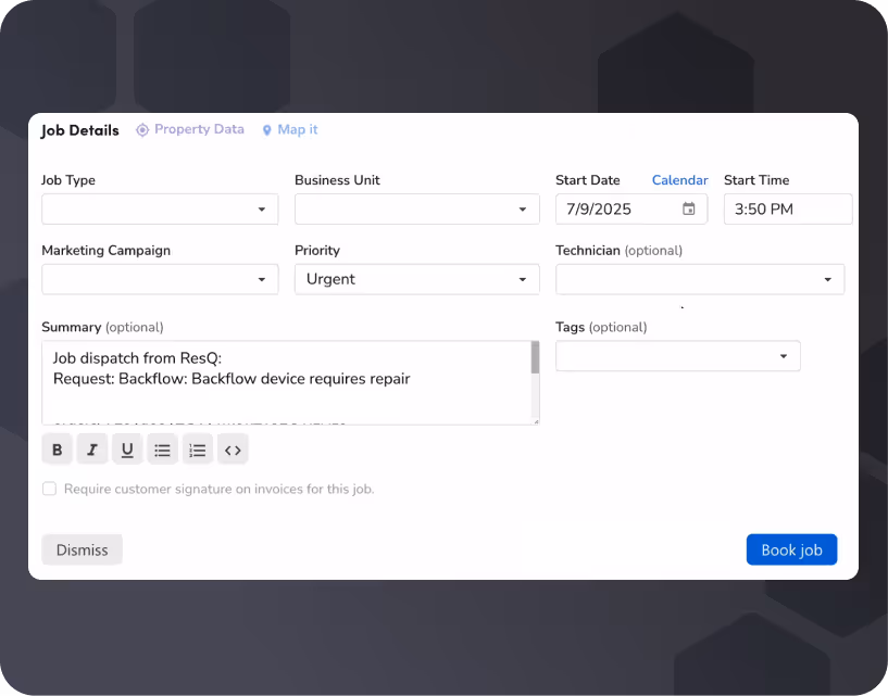New jobs populate in real-time. As soon as a facility submits a request through ResQ, it appears in your ServiceTitan booking system automatically.